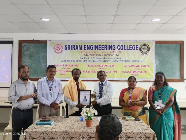 The School of Mechanical Engineering at Sriram Engineering College conducted its Association Inauguration and a Guest Lecture on 10th October 2025 at the Metrology Laboratory, marking the beginning of a new academic year of professional activities and technical enrichment.