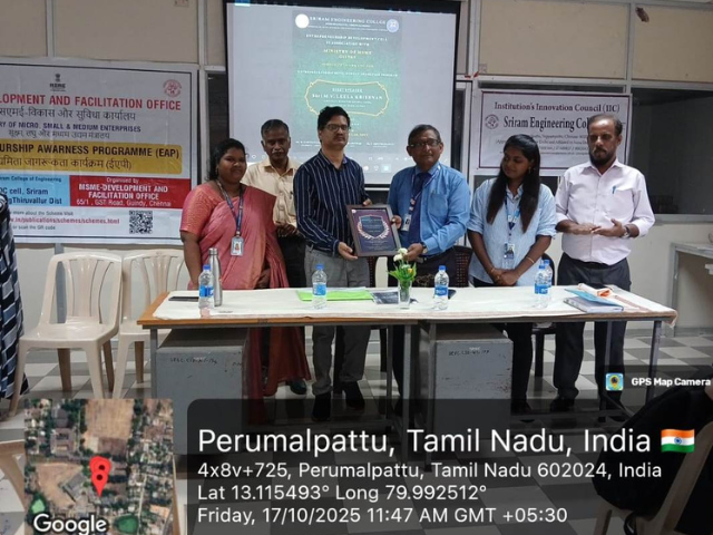 The Entrepreneurship Development Cell (EDC) hosted a highly successful Awareness Program on October 17, 2025.Chief Guest Shri Leela Krishnan (IEDS, Ministry of MSME) provided vital information on MSME's role, the definition of entrepreneurship, and pathways to becoming an entrepreneur.