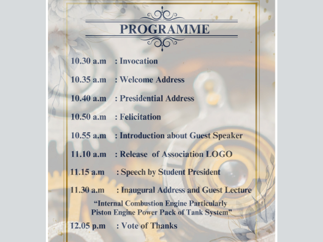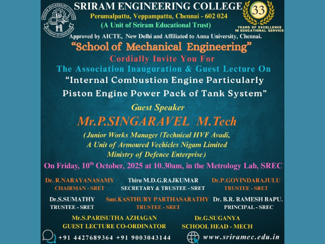 Sriram Engineering College School of Mechanical Engineering Cordially Invite You for The Association Inauguration & Guest Lecture On "Internal Combustion Engine Particularly Piston Engine Power Pack of Tank System"