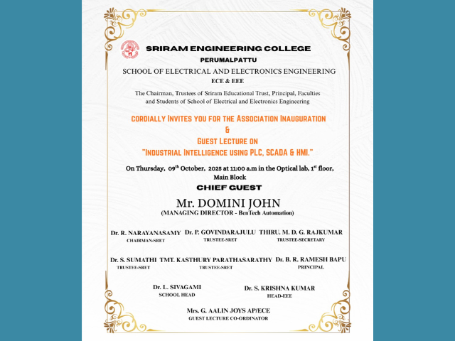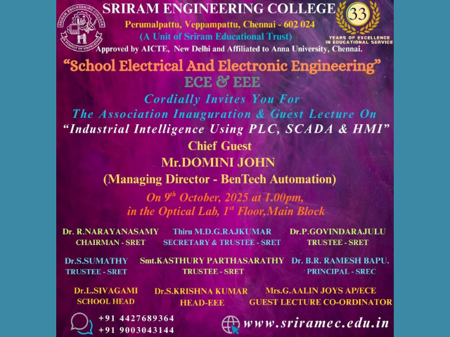 Sriram Engineering College School of Electrical & Electronics Engineering Organised a Seminar on Industrial Automation and Tools in Microwave lab ECE on 24-10-2024. Guest Speaker : Mr. Sujeeth Vishnu, Business Development Engineer, Mr. M. Karkuvel Application Engineer, AGIIT, Chennai. Venue : Microwave lab ECE Date : 24-10-2024, Time : 2.00 P.M.