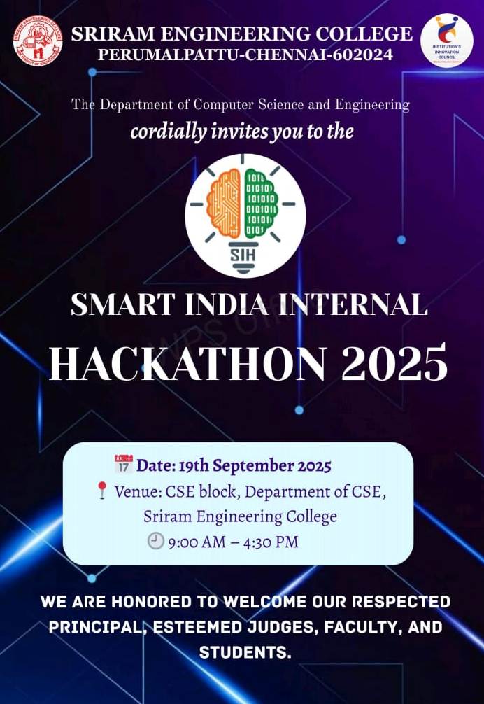 Chennai, Tamil Nadu – 19/09/2025: Sriram Engineering College hosted a 6-hour Internal Hackathon on 19th September 2025, preparing students for the Smart India Hackathon (SIH) 2025. The campus was filled with energy as students collaborated to craft innovative, technology-driven solutions.