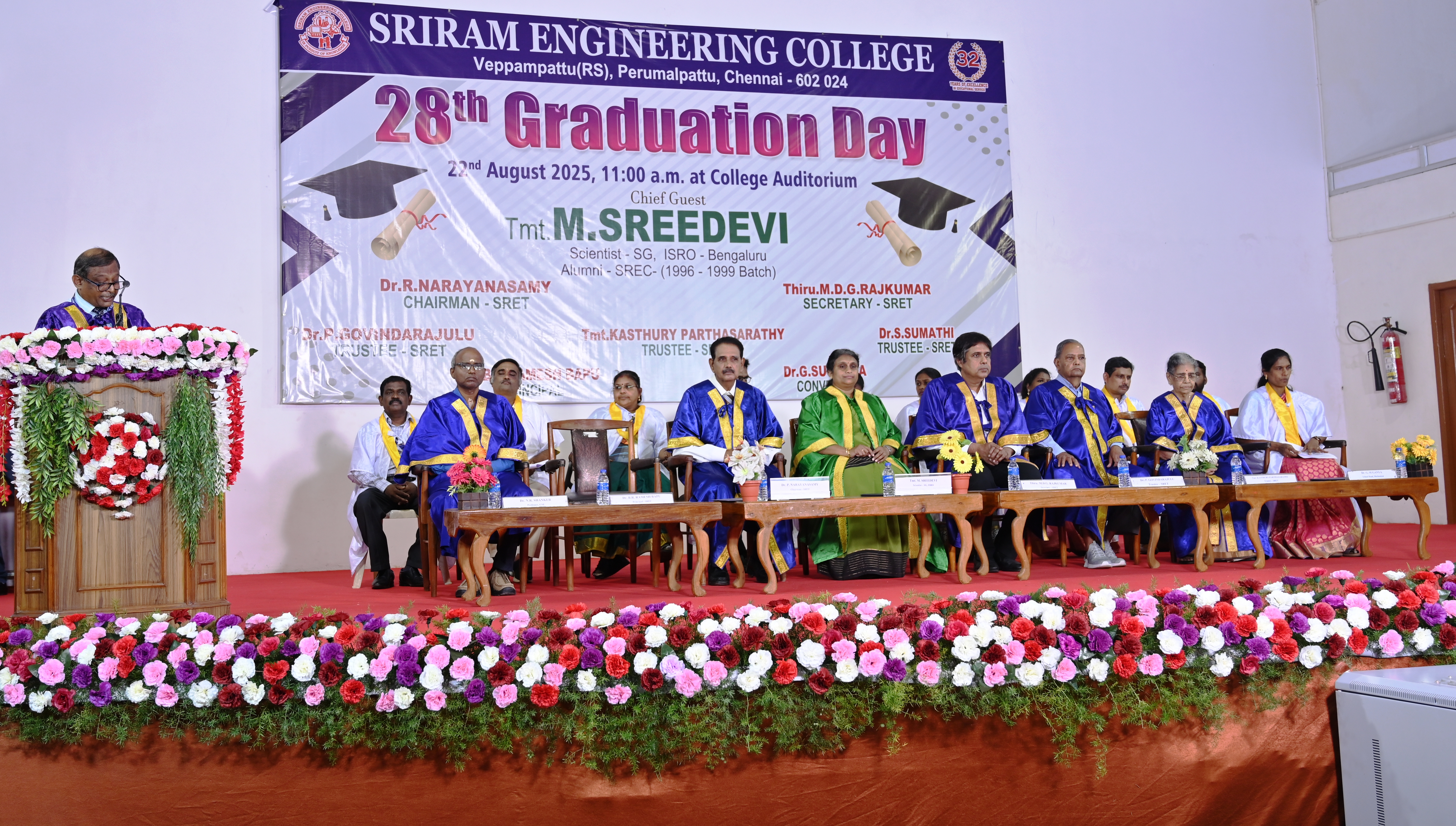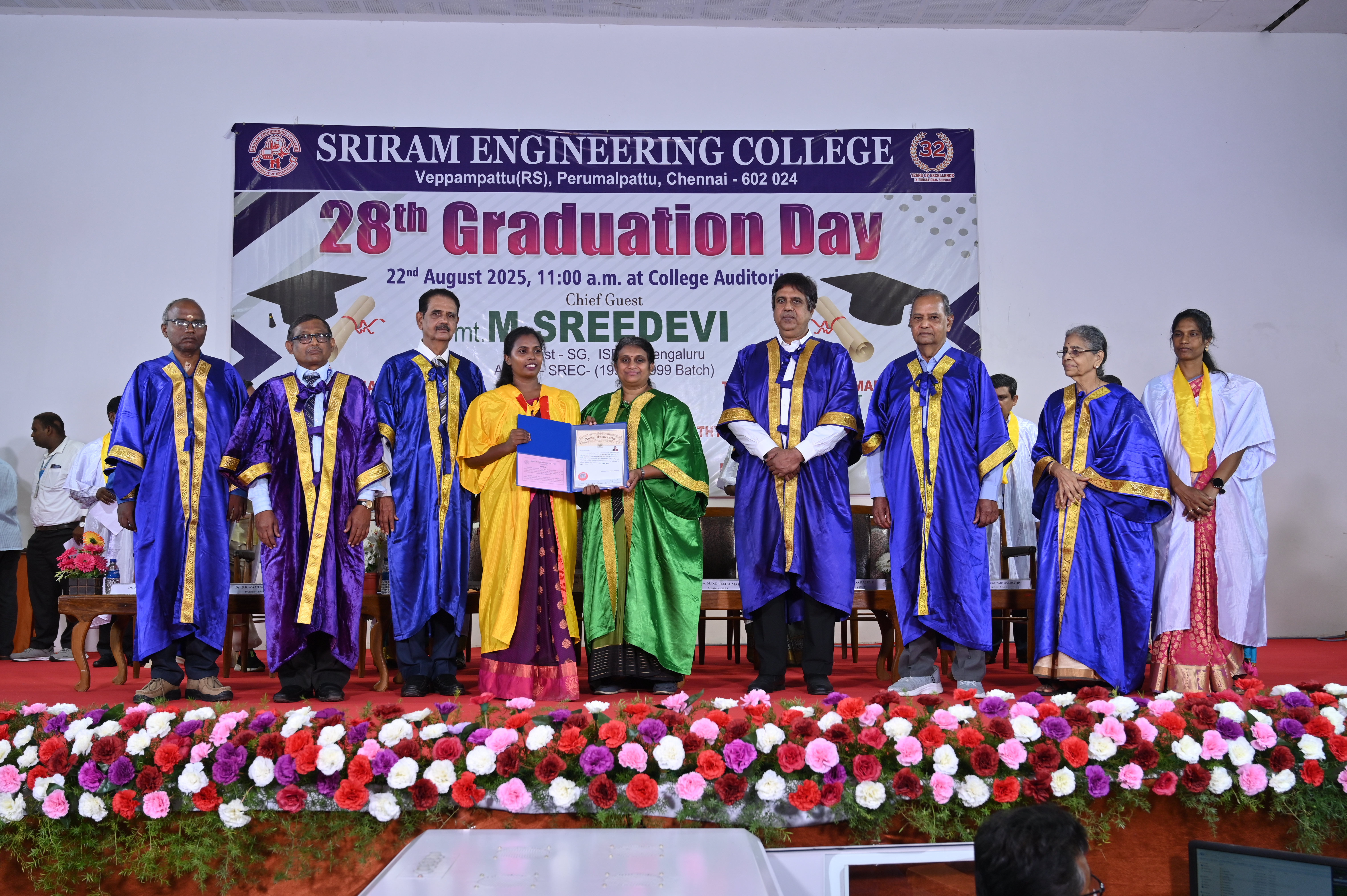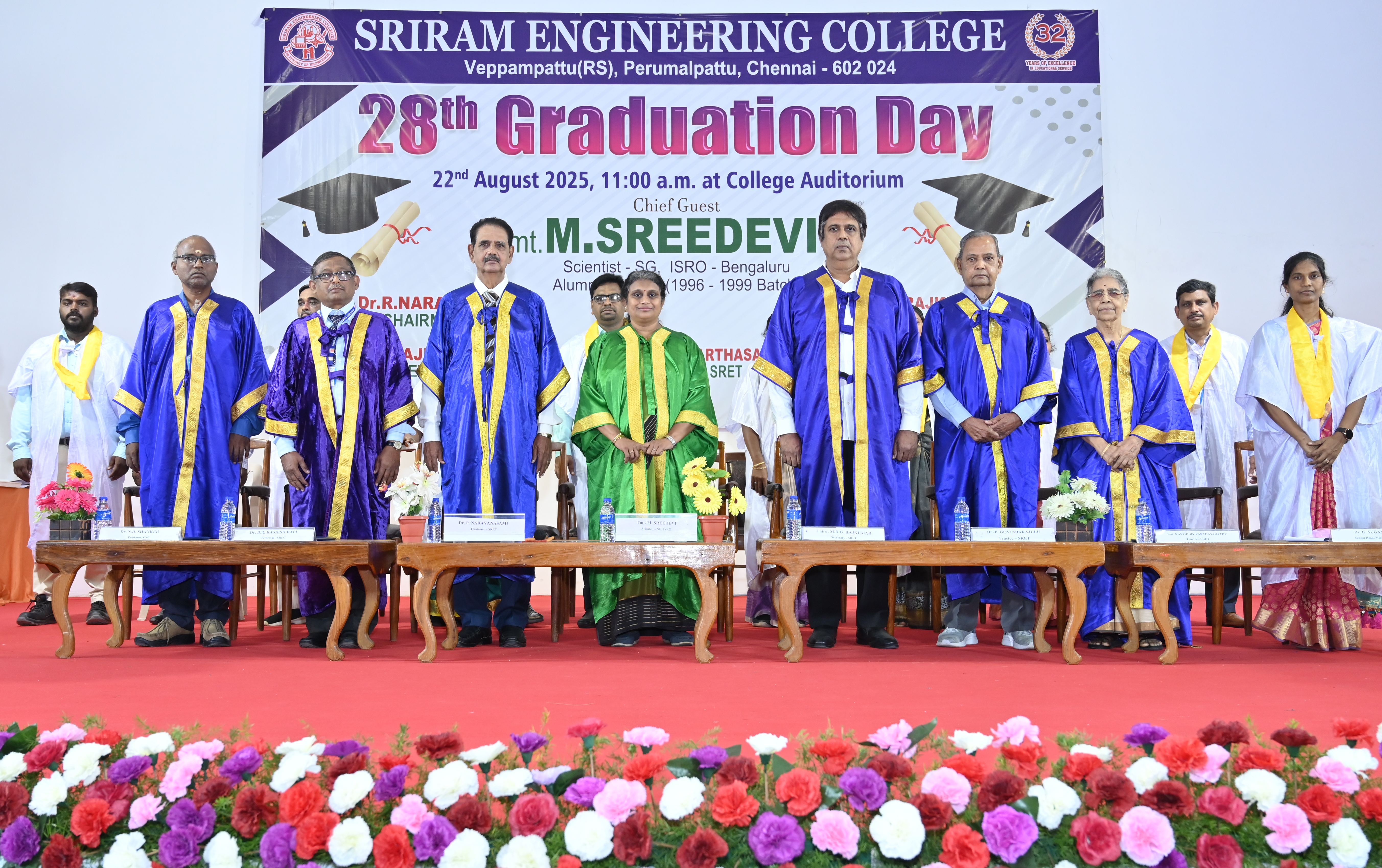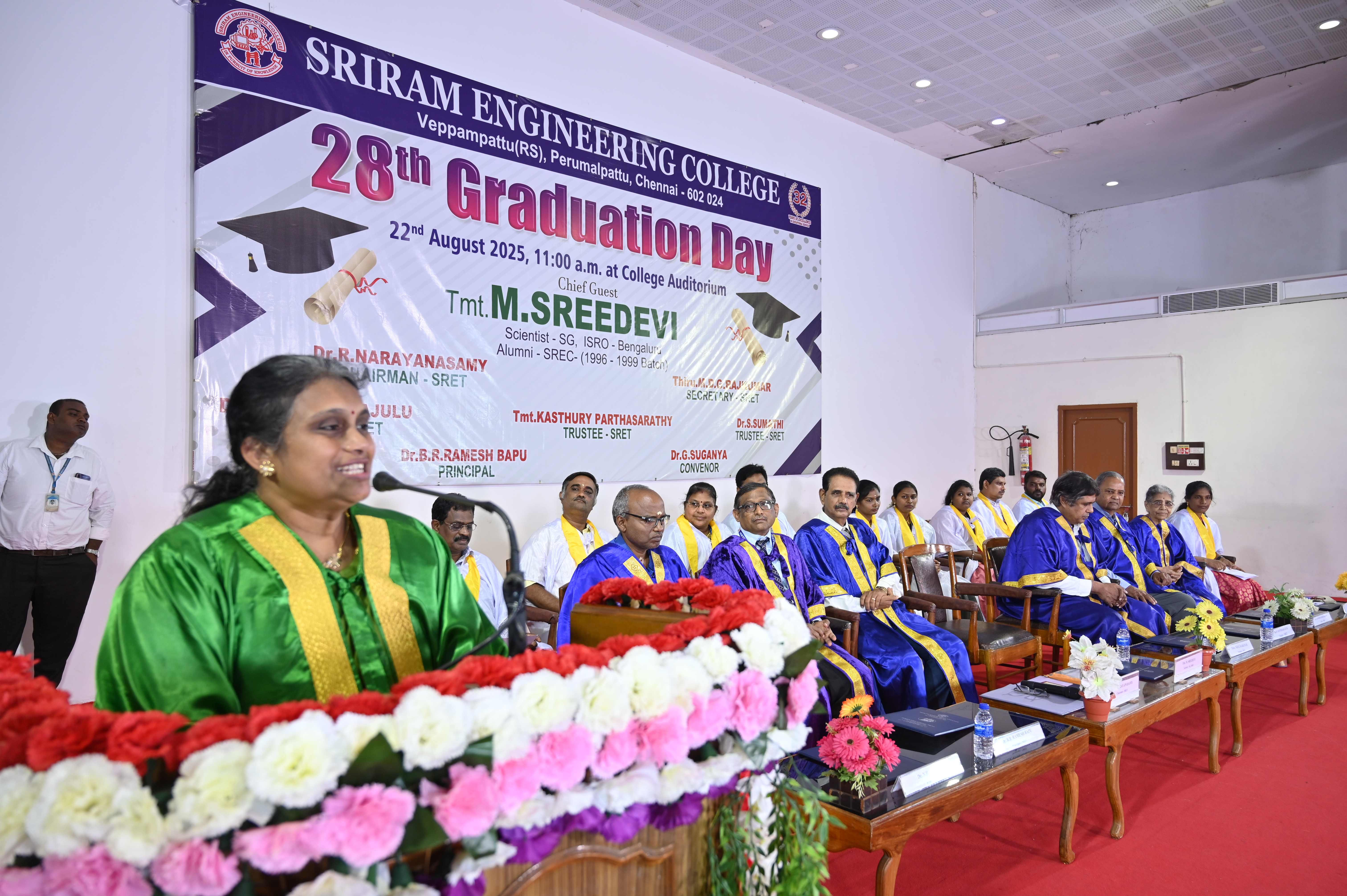 Sriram Engineering College proudly celebrated its 28th Graduation Day on 22nd August 2025 with Tmt. M. Sreedevi, Scientist-SG, ISRO & SREC Alumna, as the Chief Guest.