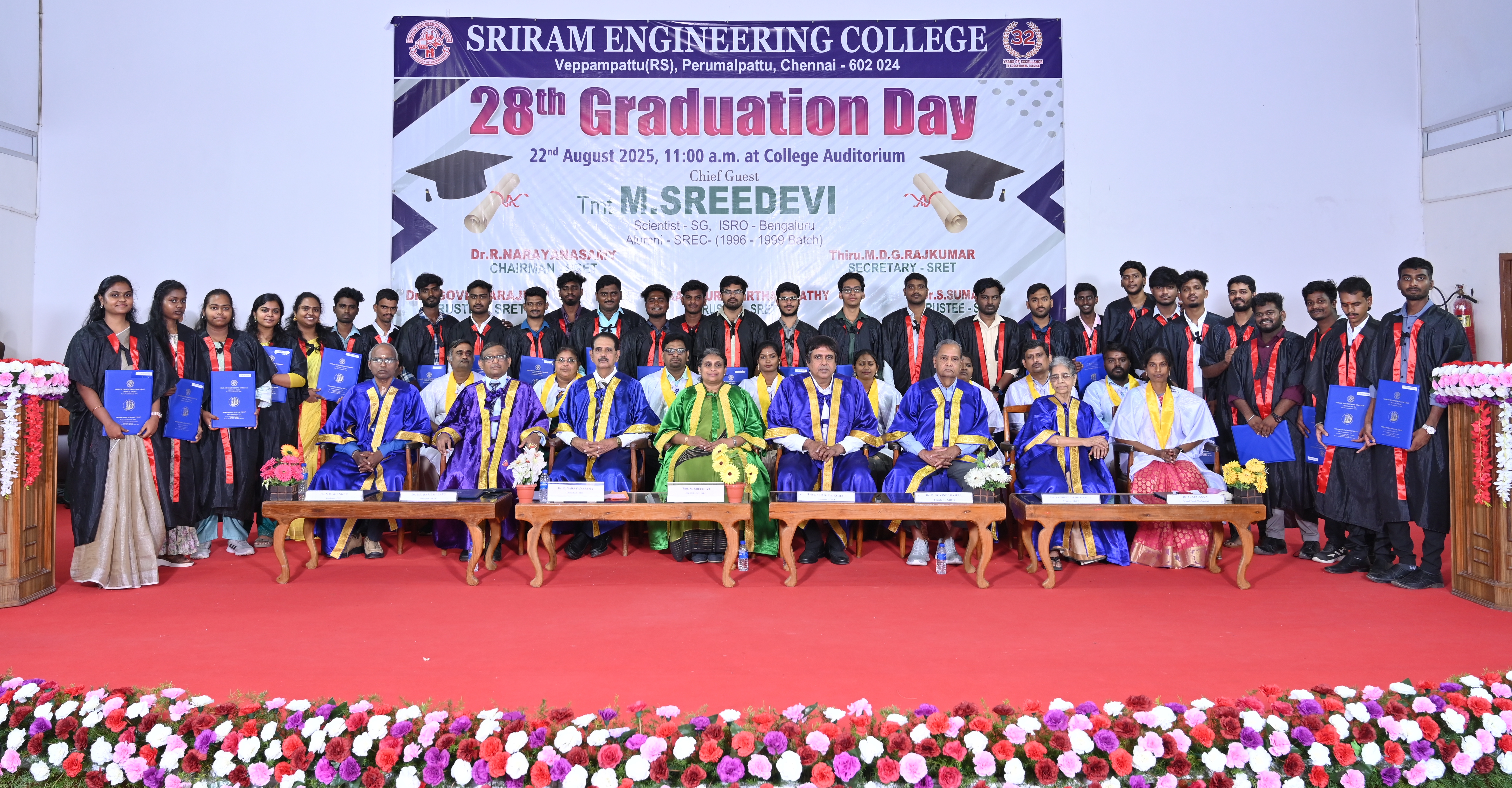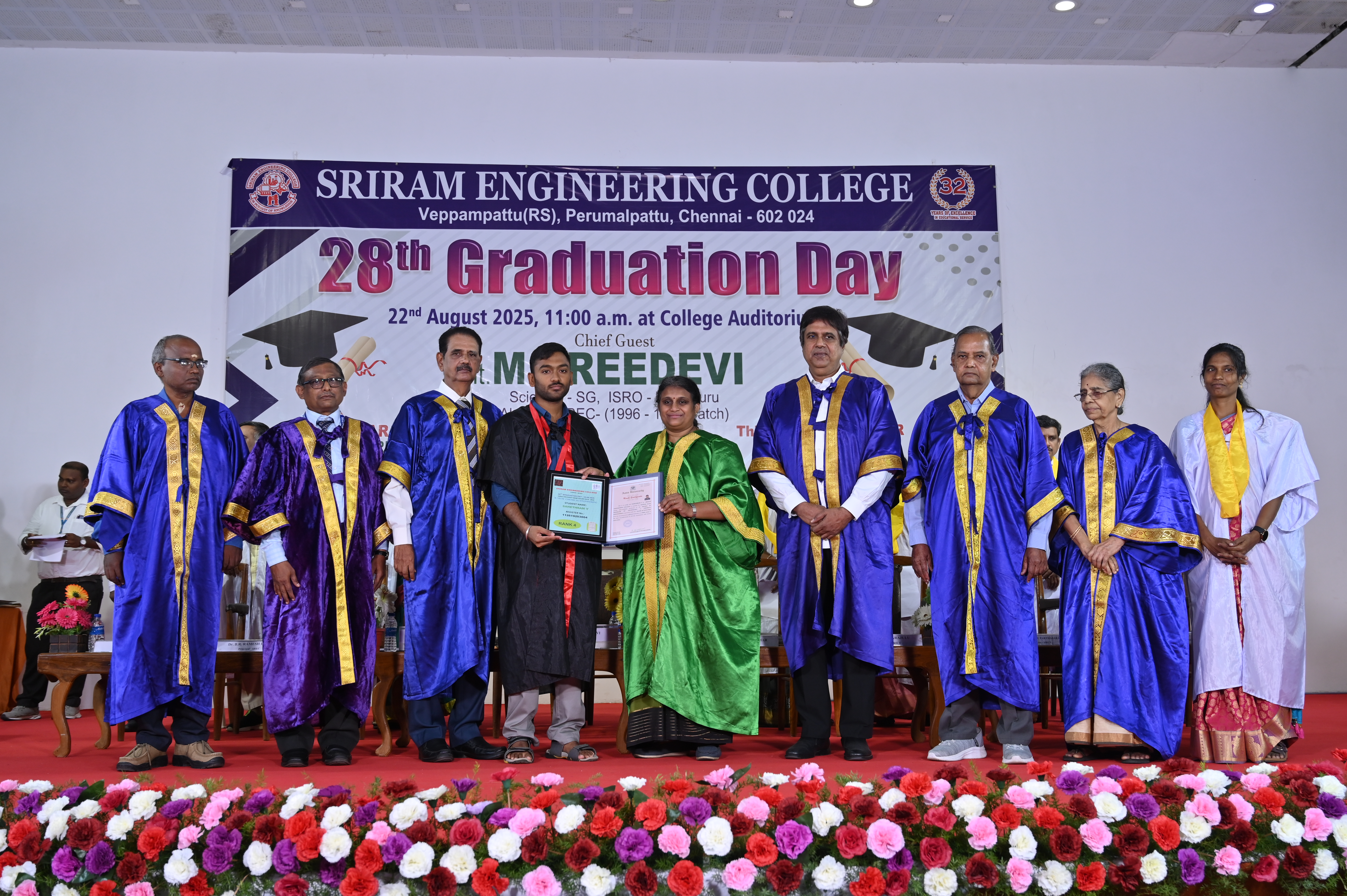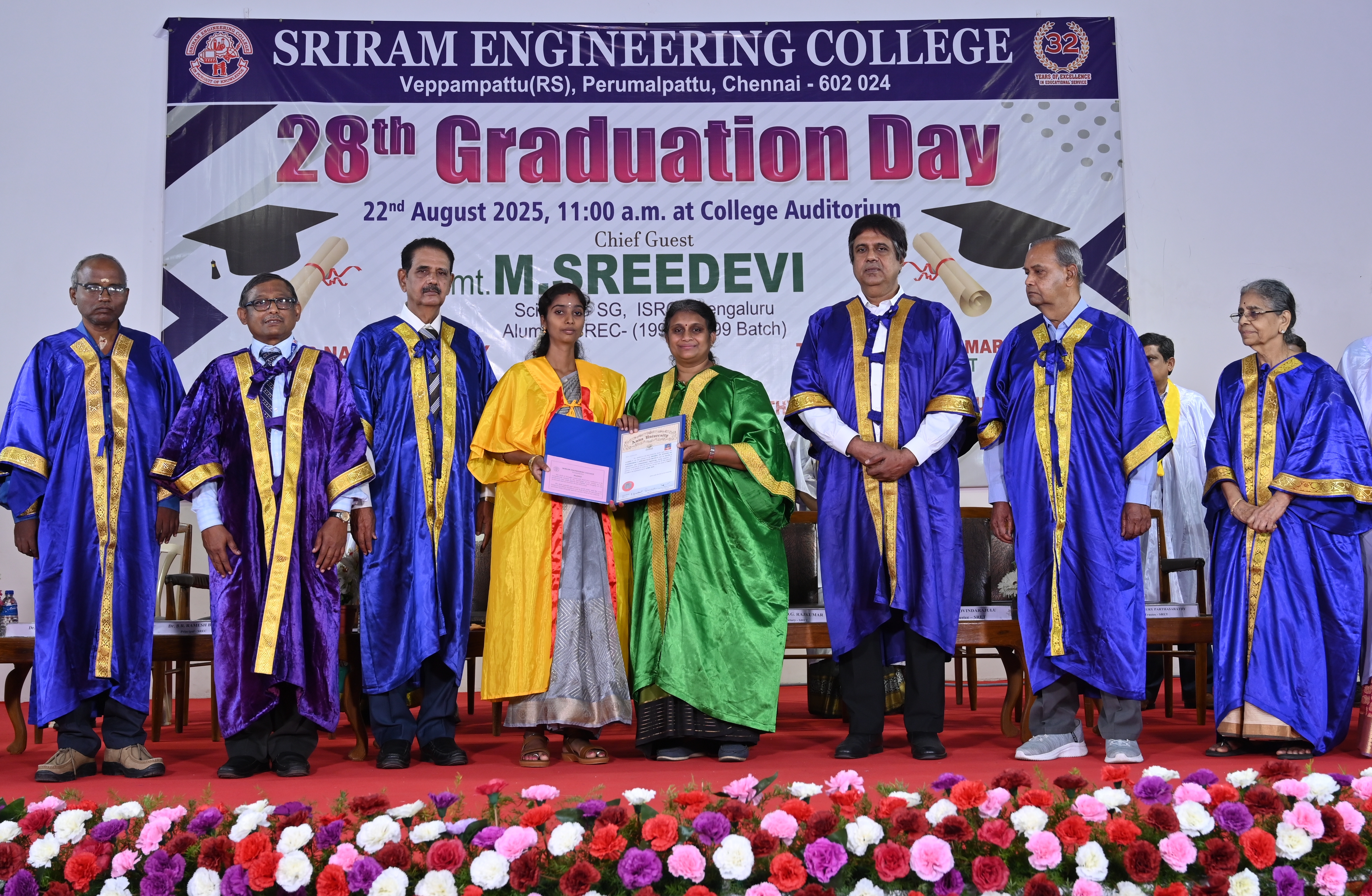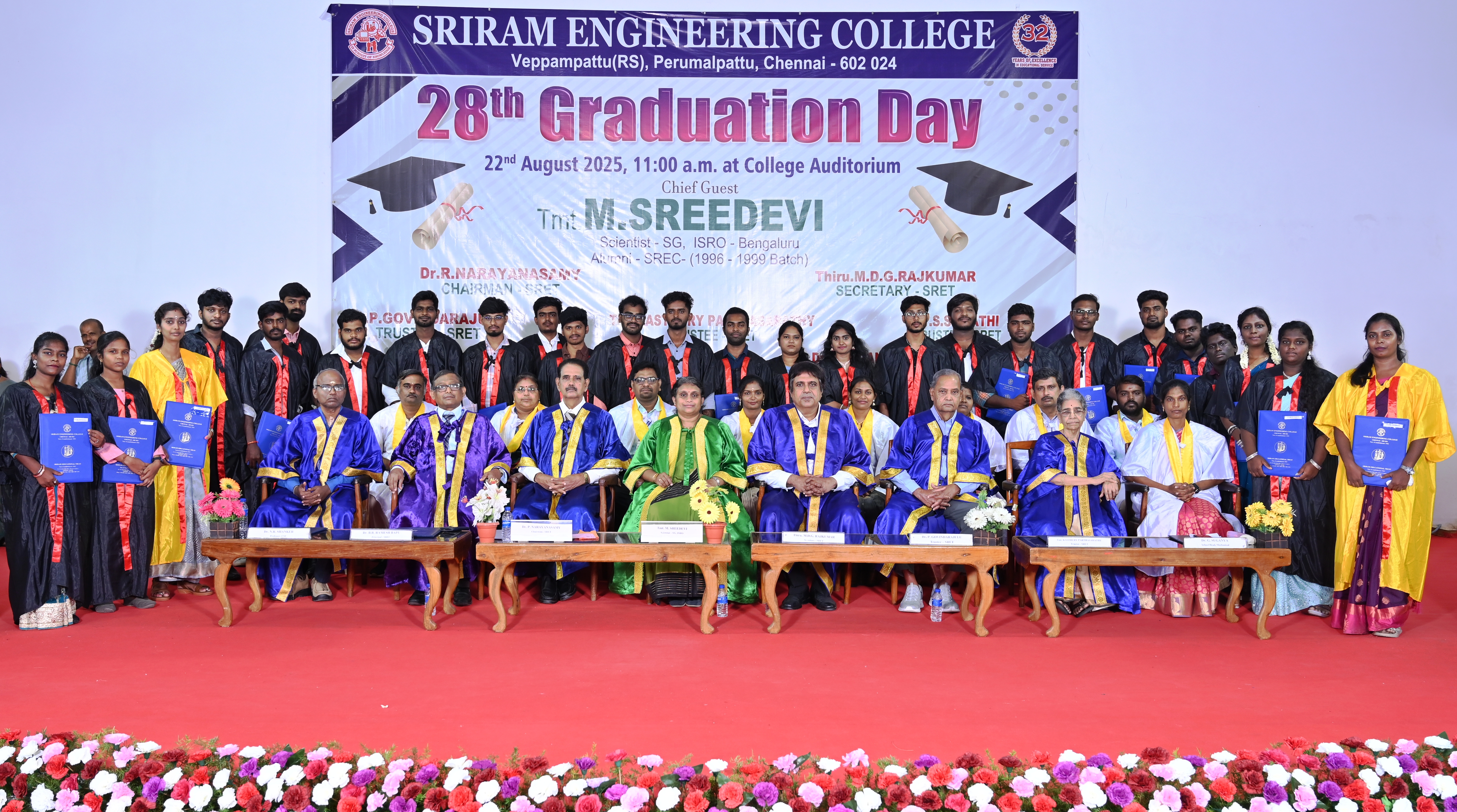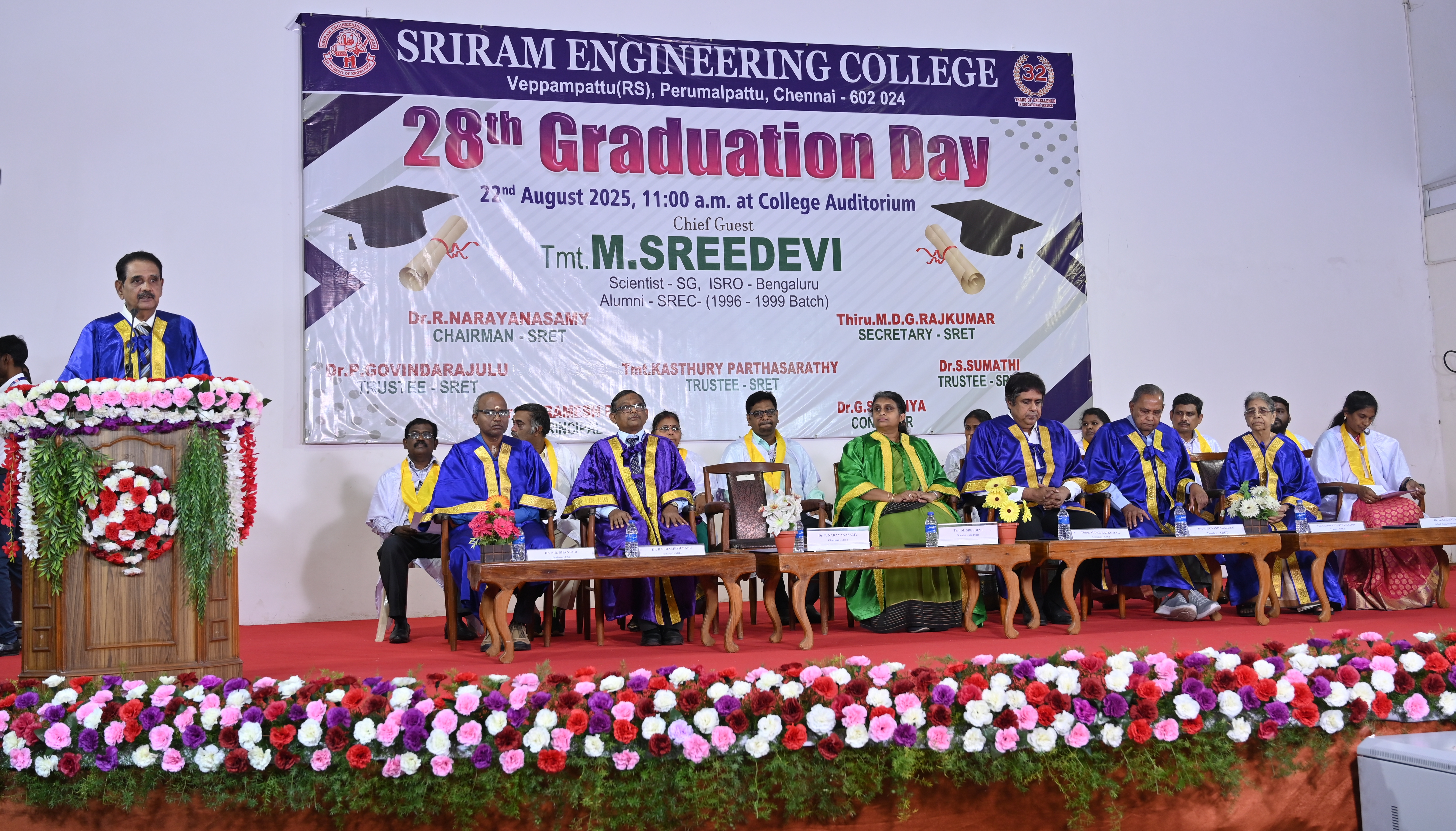 Sriram Engineering College proudly celebrated its 28th Graduation Day on 22nd August 2025 with Tmt. M. Sreedevi, Scientist-SG, ISRO & SREC Alumna, as the Chief Guest.
