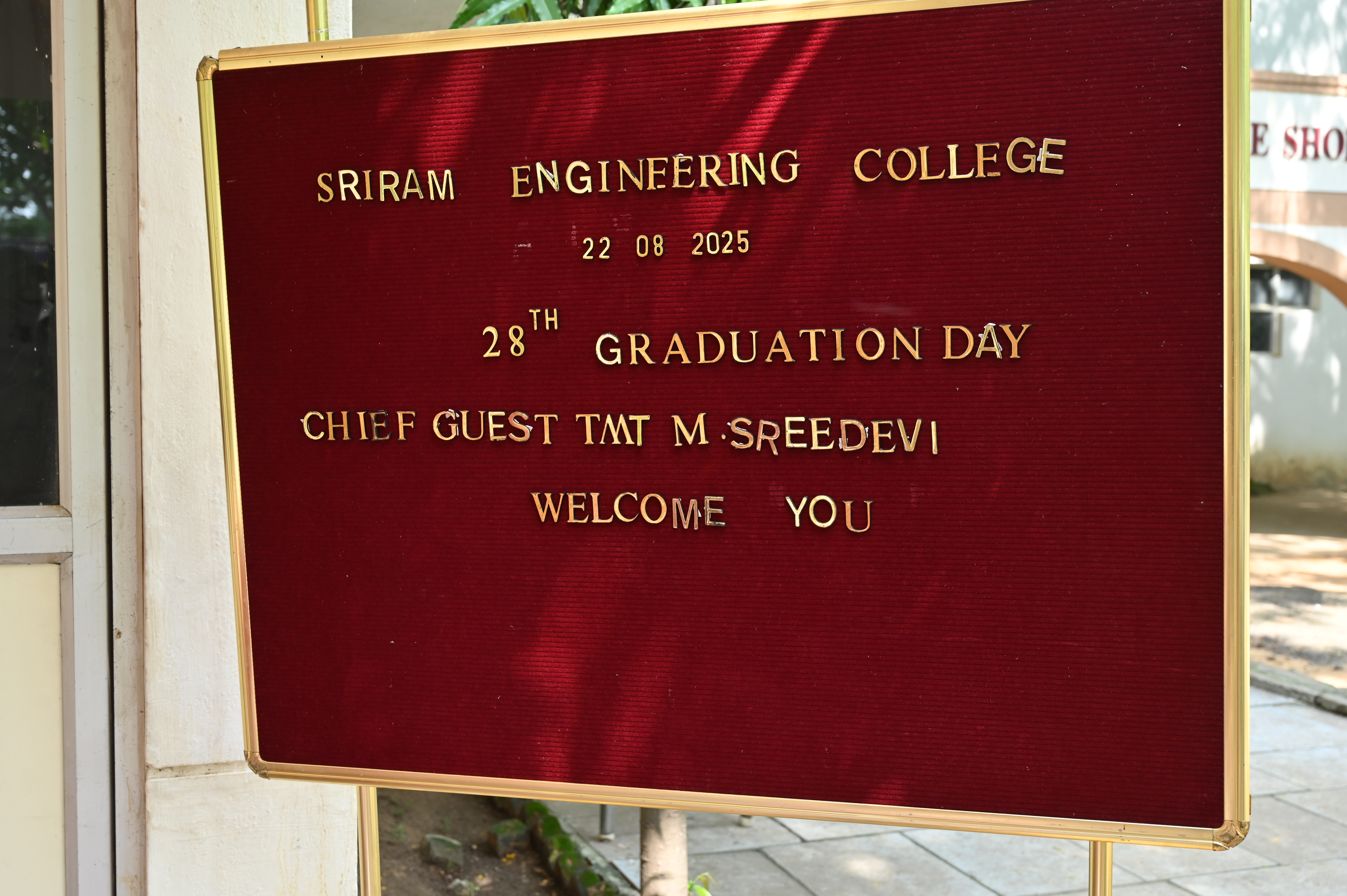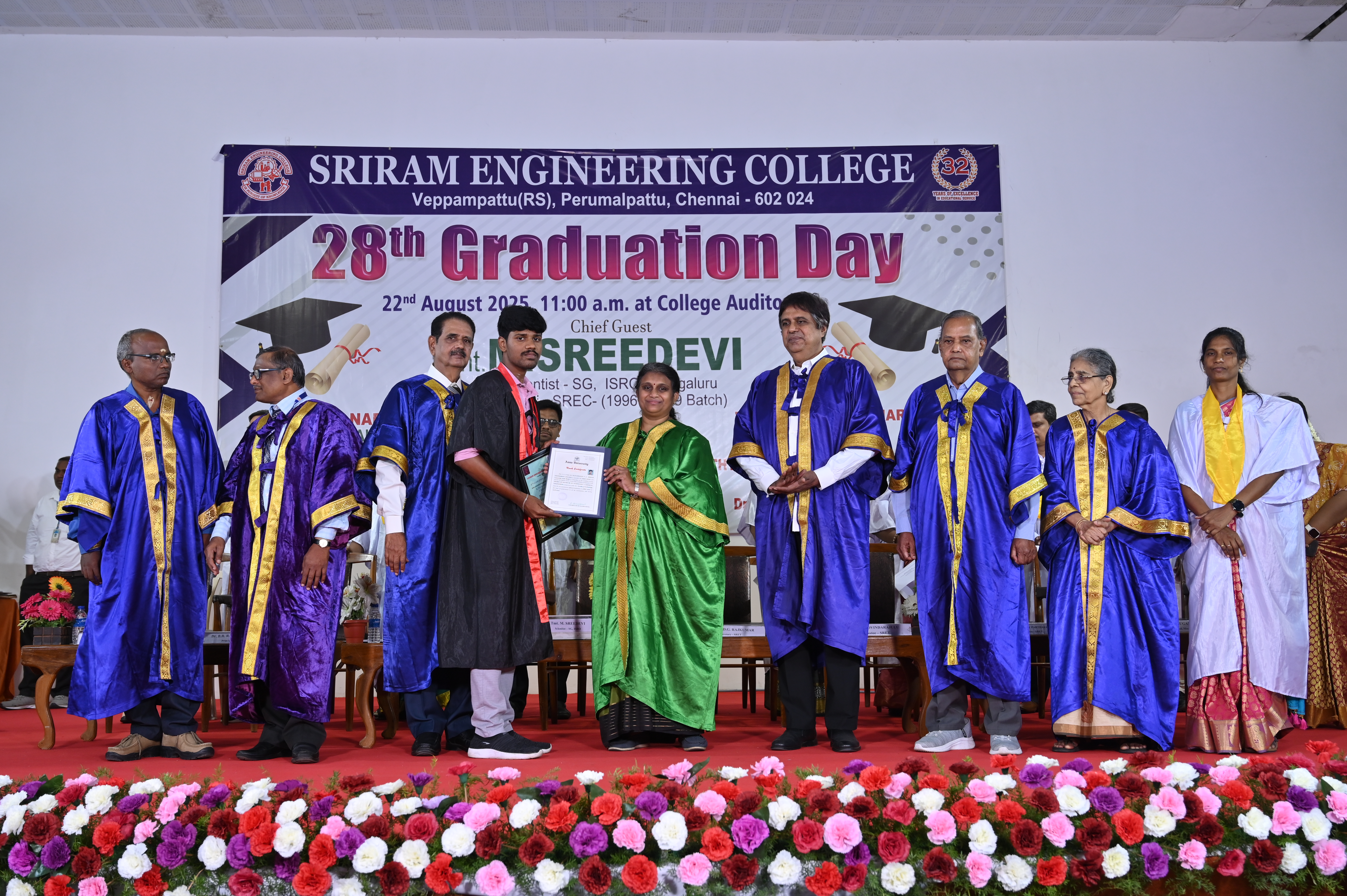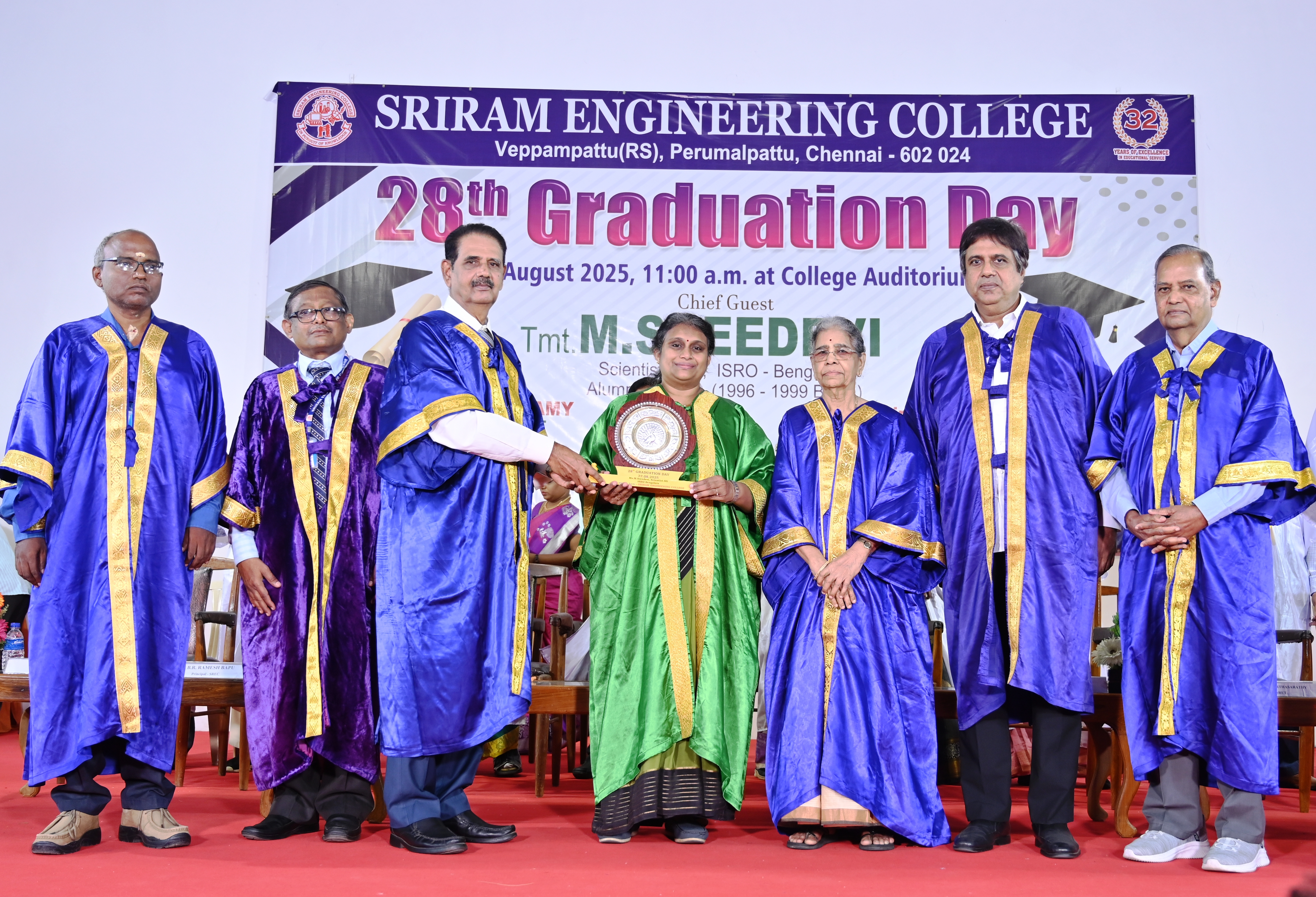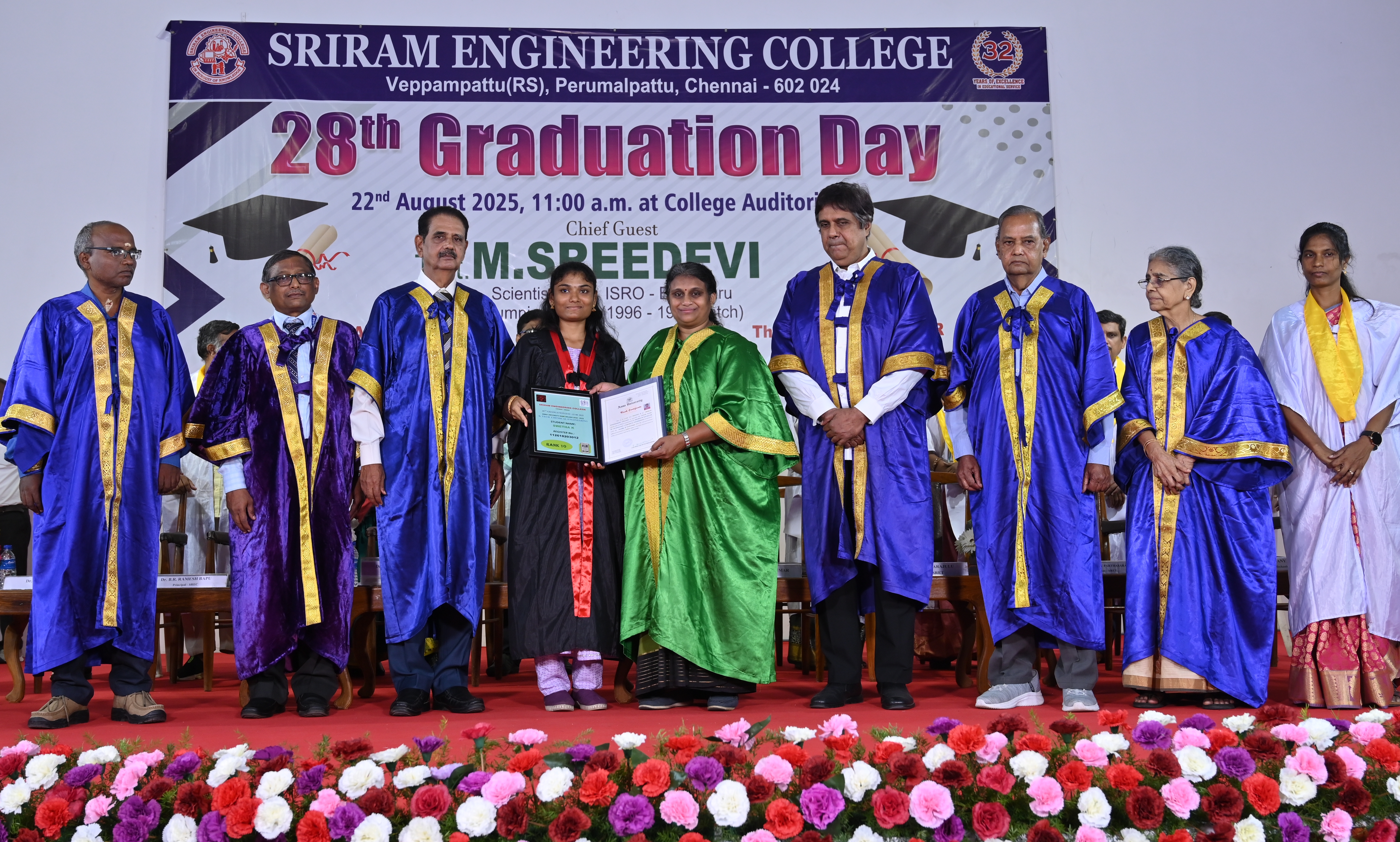 Sriram Engineering College proudly celebrated its 28th Graduation Day on 22nd August 2025 with Tmt. M. Sreedevi, Scientist-SG, ISRO & SREC Alumna, as the Chief Guest.