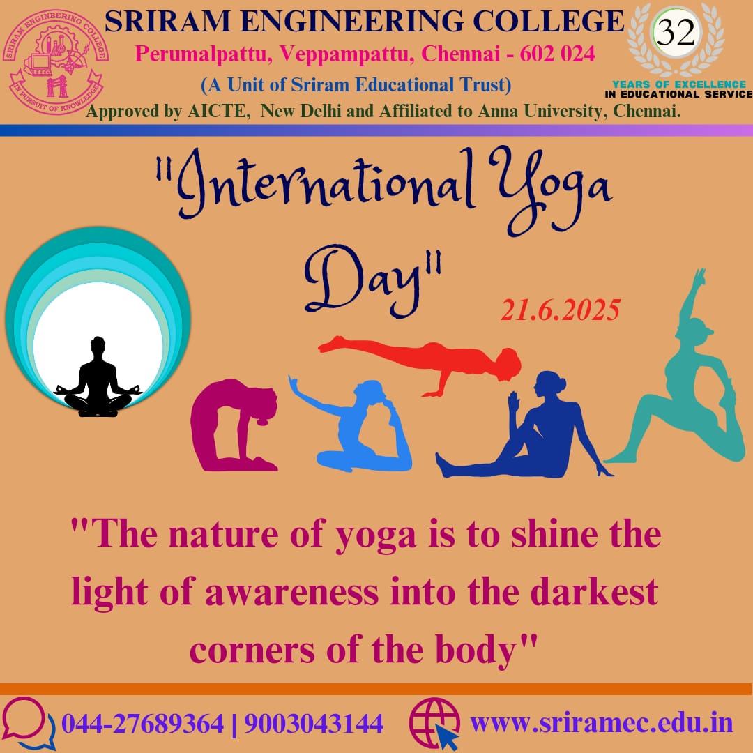 Sriram Engineering College celebrated International Yoga Day with great enthusiasm on 21st June 2025. Students and staff members actively participated in guided yoga sessions conducted on campus, promoting physical fitness, mental wellness, and inner peace. The event highlighted the theme "The nature of yoga is to shine the light of awareness into the darkest corners of the body" and encouraged a healthy lifestyle for all participants.