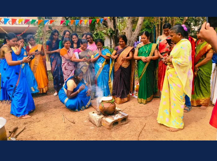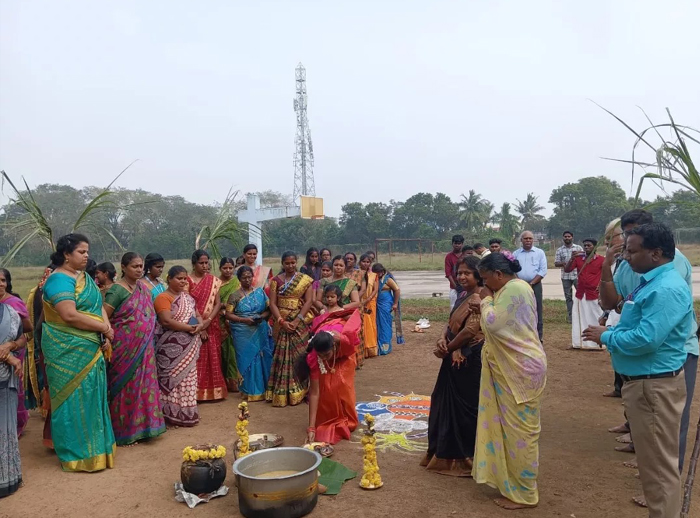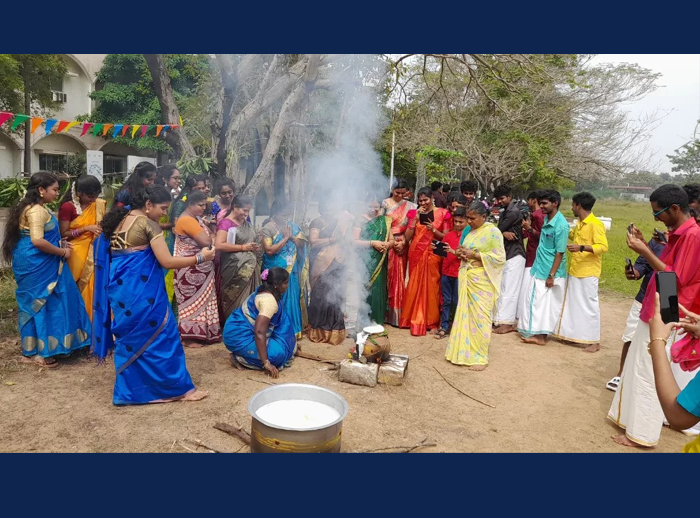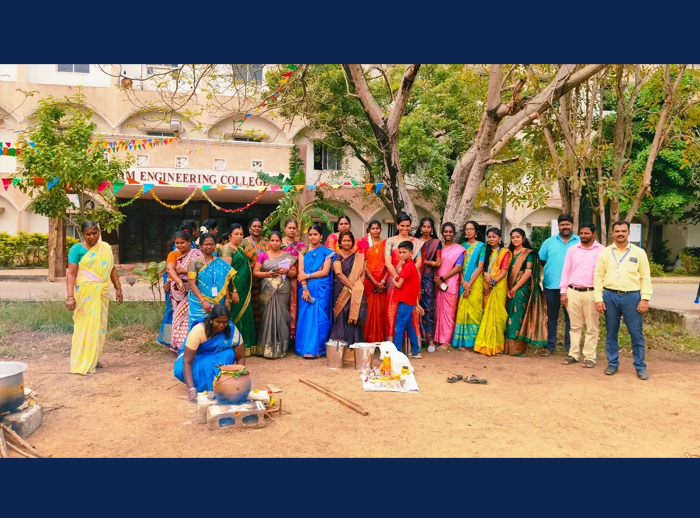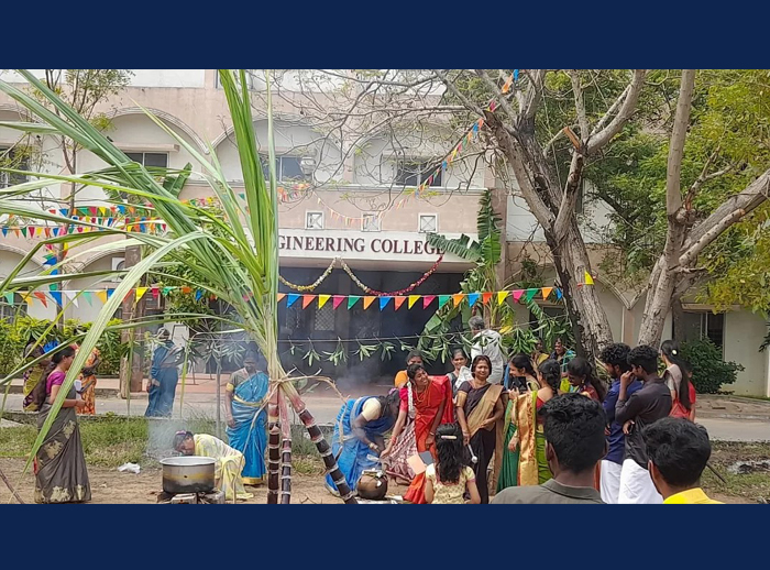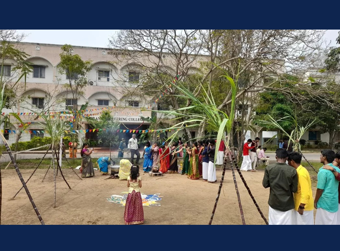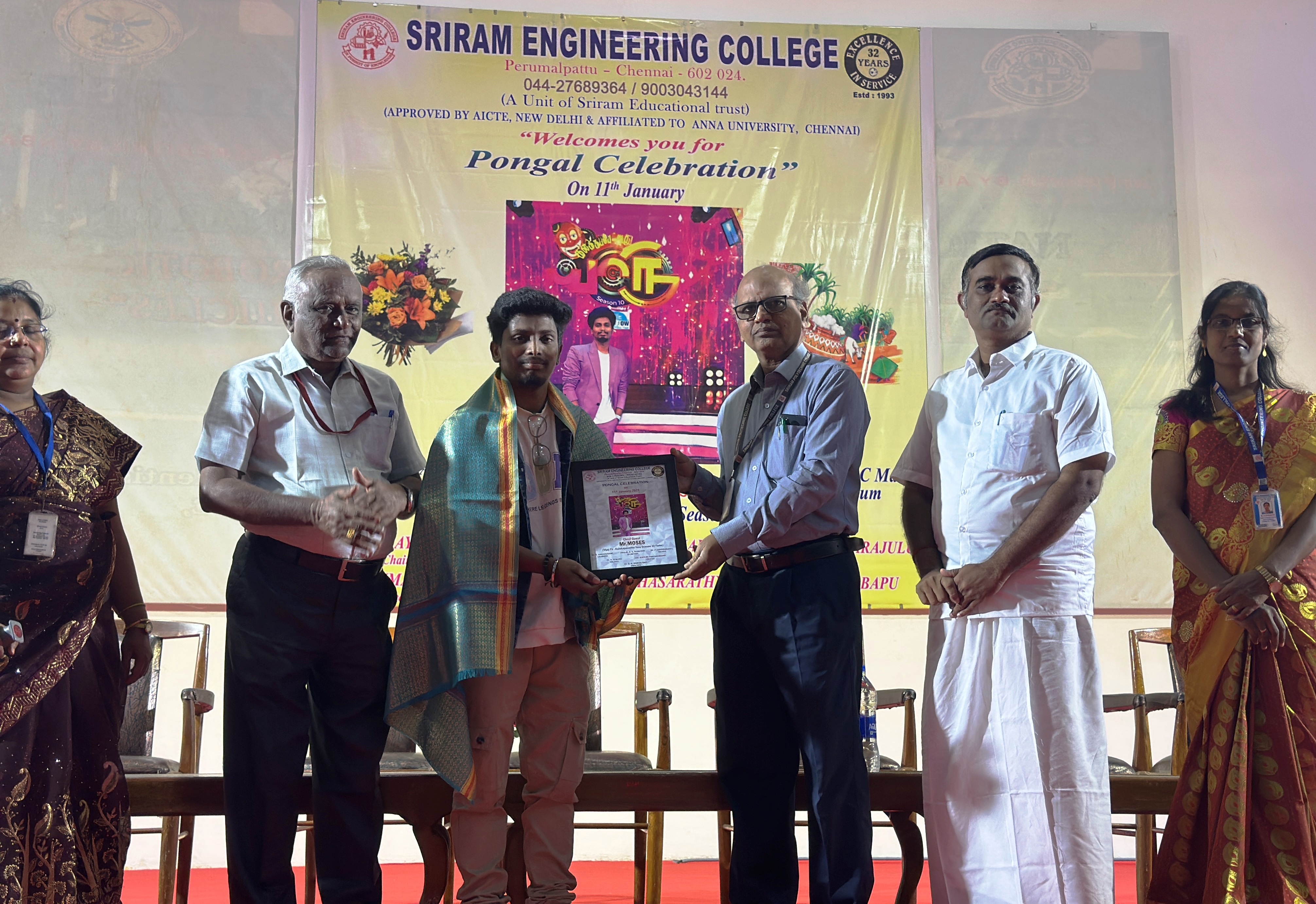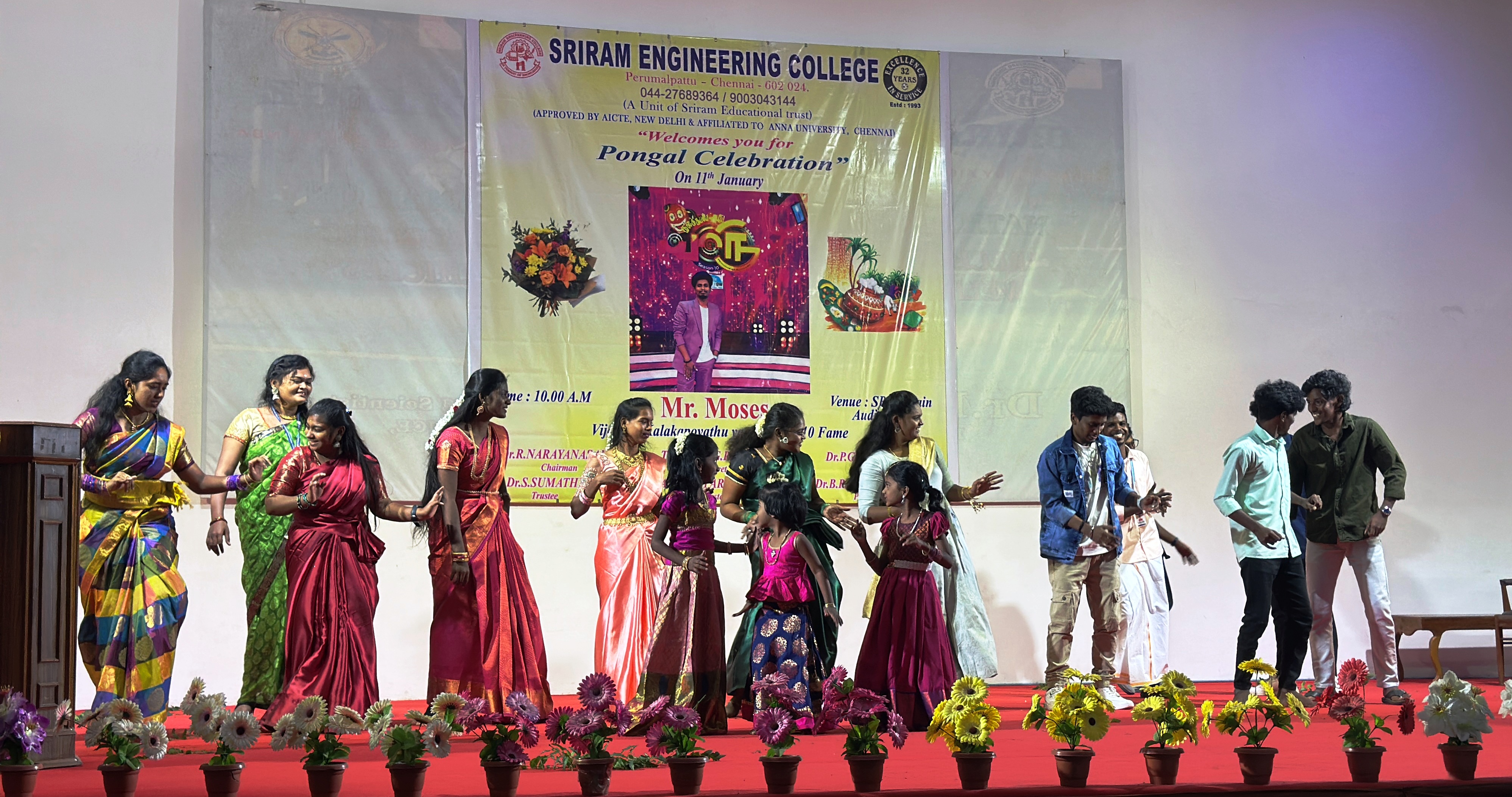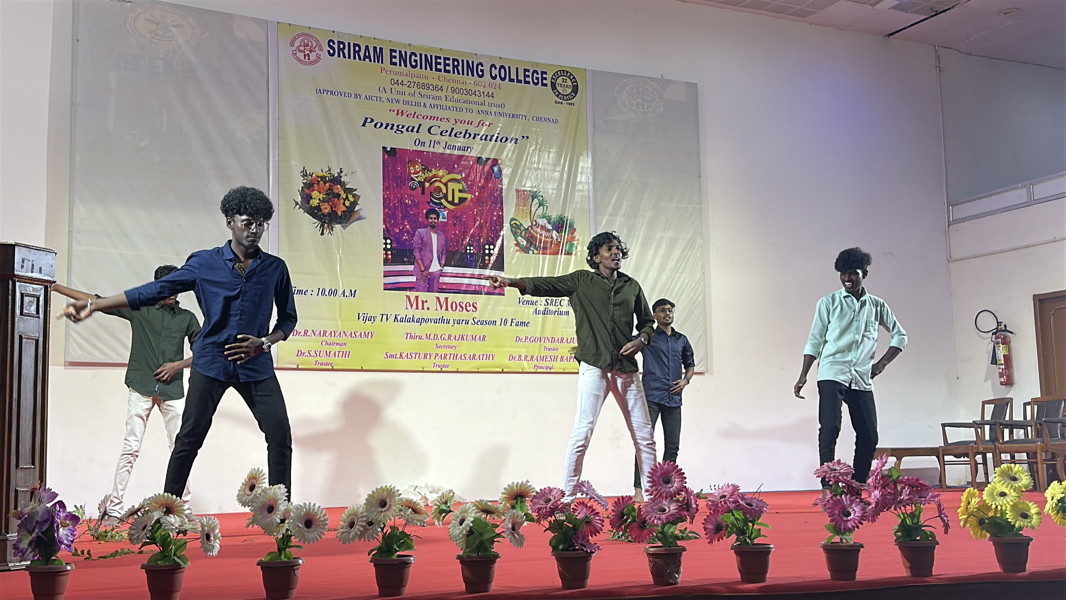 Sriram Engineering College celebrated a vibrant Pongal festival on January 11, 2025, with much enthusiasm. The event featured Special Guest Mr. Moses, a popular personality from Vijay TV's Kalakapovathu Yaru season 10. Students and faculty members came together to enjoy the festive spirit. The celebration included traditional activities like Uriyadi (a game where participants break a pot blindfolded), rope strike, and kolam (beautiful rangoli designs). The students displayed their energy and joy through a lively dance performance, further enhancing the festive mood. Everyone, including the chief guest, Mr. Moses, had a wonderful time, making it a memorable event for the entire college community.