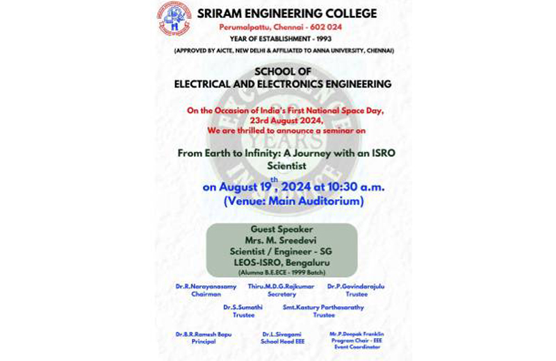 Sriram Engineering College School of Electrical and Electronics Engineering, On the Occasion of India’s First National Space Day, 23rd August 2024, we are thrilled to announce a seminar on ” From Earth to Infinity: A Journey with an ISRO Scientist ” on 19th August 2024 at 10:30 a.m.